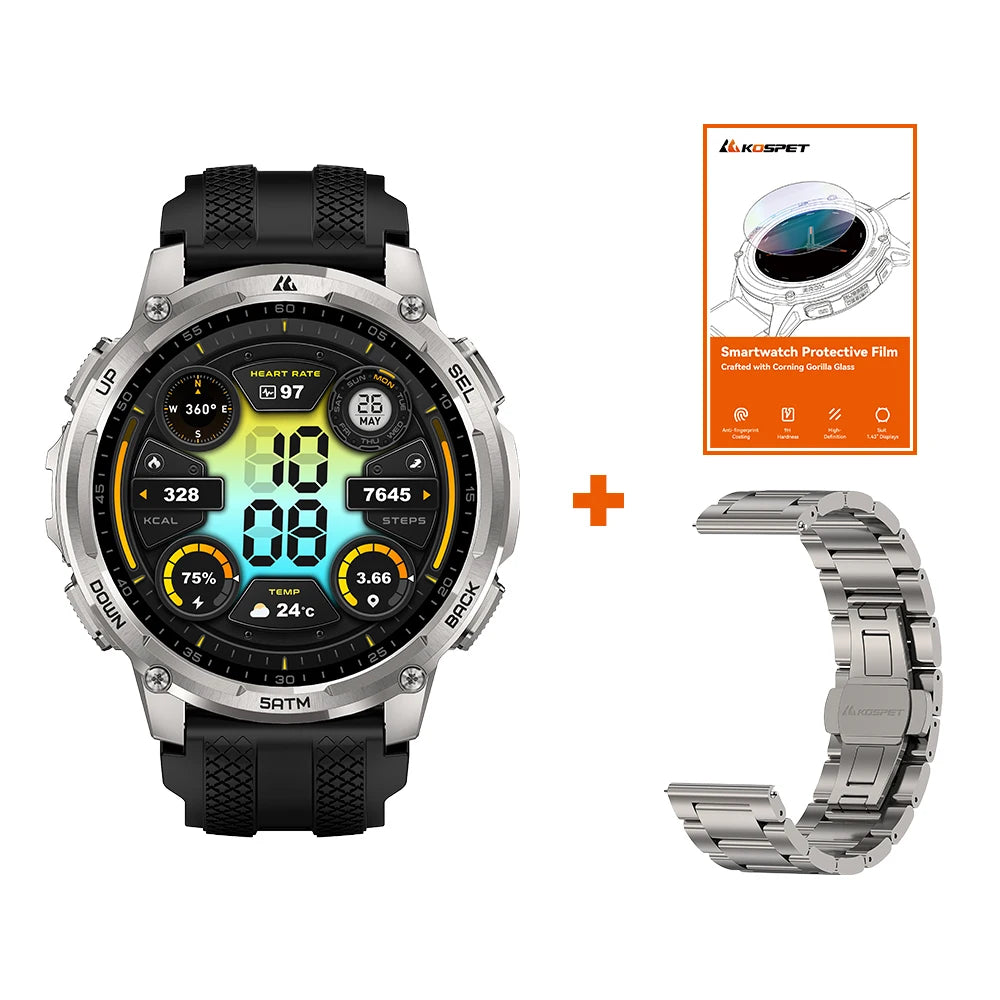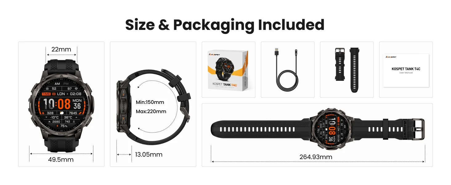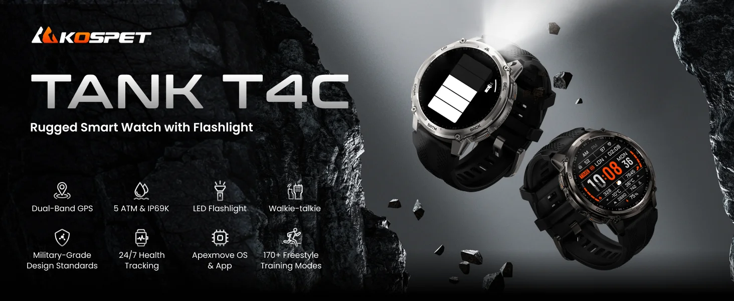 KOSPET TANK T4C Smartwatch Men’s Outdoor Rugged Watch with Flashlight Dual‑Band GPS 50M Waterproof Fitness & Health Tracker