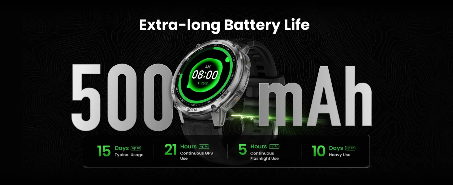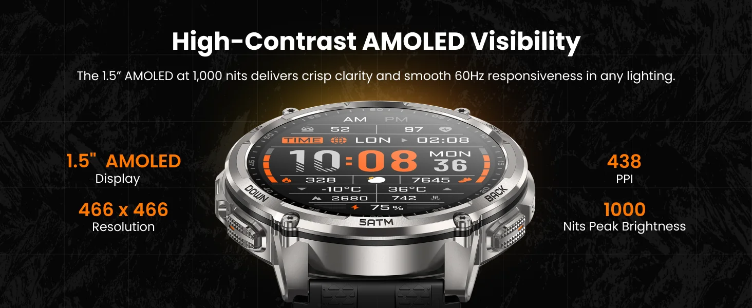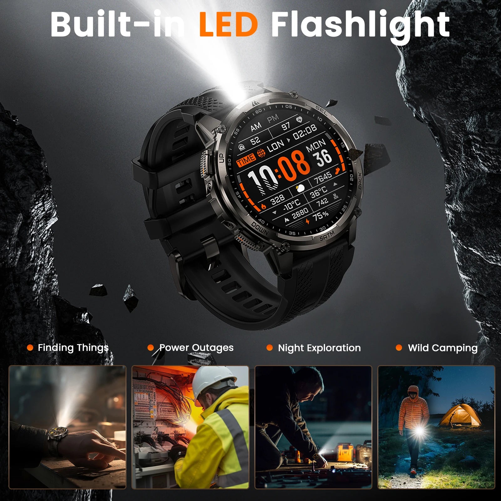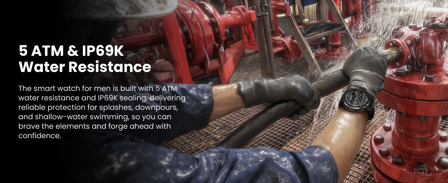 Rigorously tested and certified against 15 U.S. MIL-STD-810H standards, this rugged smartwatch is built for ultimate durability. Engineered to prove its reliability in the most extreme conditions, ensuring it performs when you need it most.【5ATM & IP69K Waterproof】