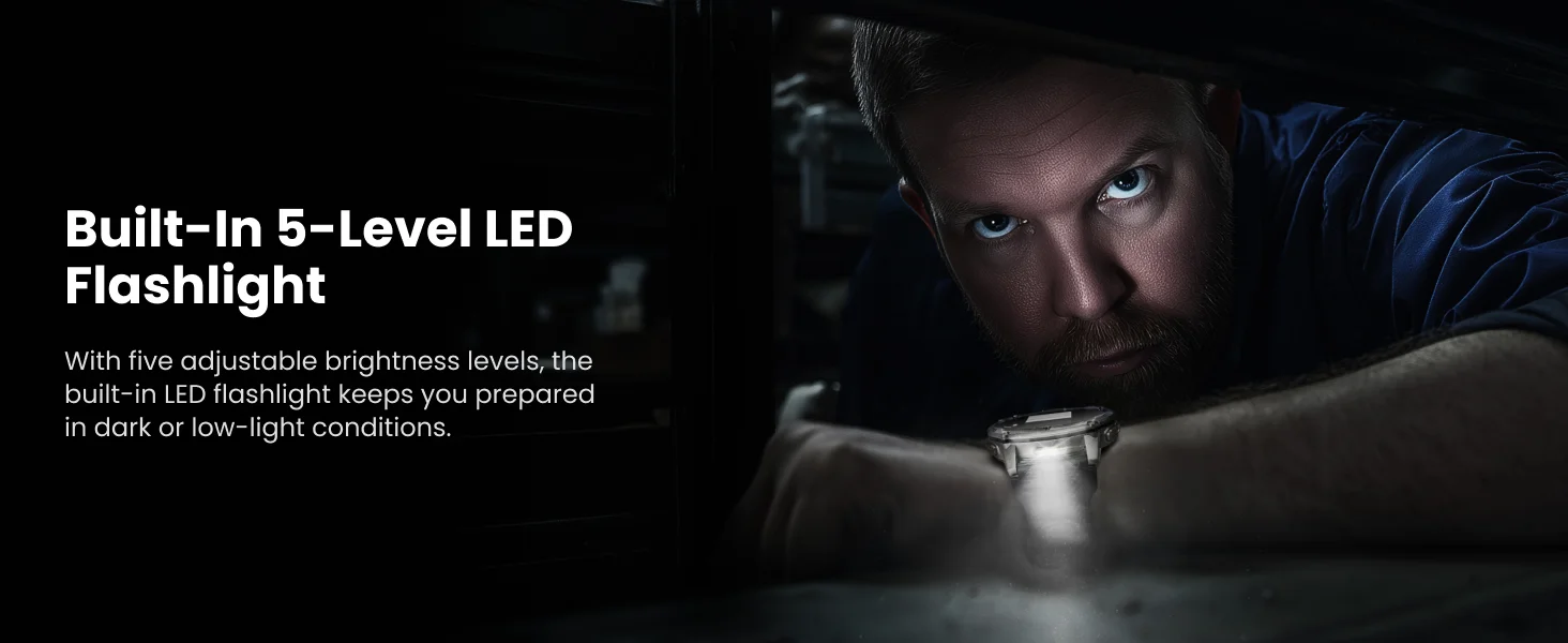 Brave the elements with confidence. Boasting a 5ATM water-resistance rating for depths up to 50 meters and the highest IP69K rating for ingress protection, this watch is fully sealed against water, dust, and high-pressure spray.【Built-in LED Flashlight】